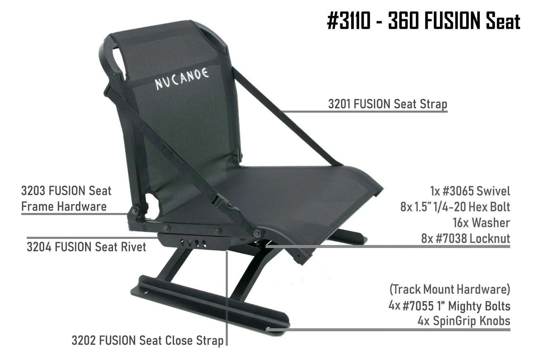 NuCanoe 360 Fusion Seat – tai premium besisukanti sėdynė su išskirtine Fused-Frame technologija, suteikianti neprilygstamą komfortą ir atramą valandų valandas vandenyje, diena iš dienos, metai iš metų. Audinys ir rėmas sujungti į vieną vientisą konstrukciją, todėl sėdynė nesagsta ir visuomet išlaiko tolygų įtempimą. Rekumbentinė sėdynės dalis su reguliuojamu atlošu garantuoja patogią sėdėseną bet kokio ilgio kelionėse.