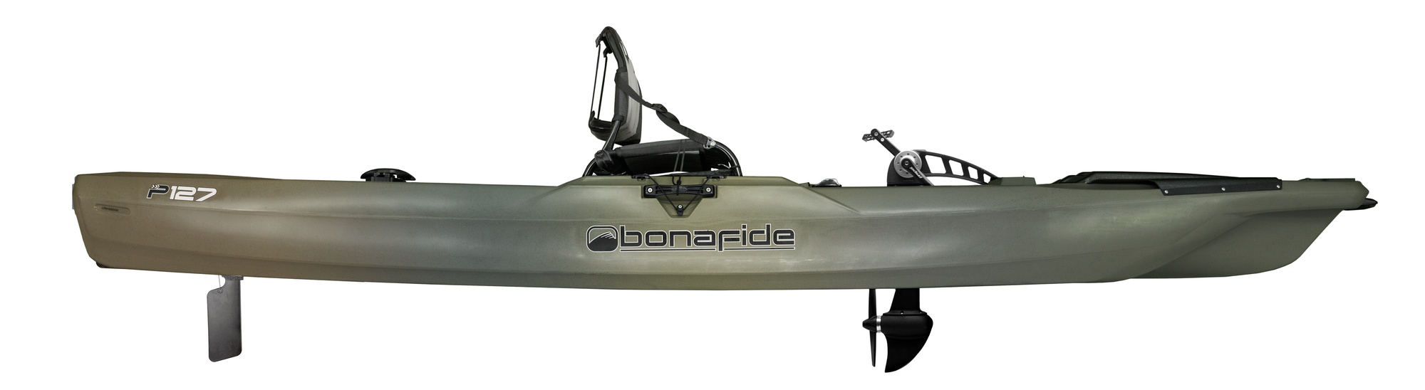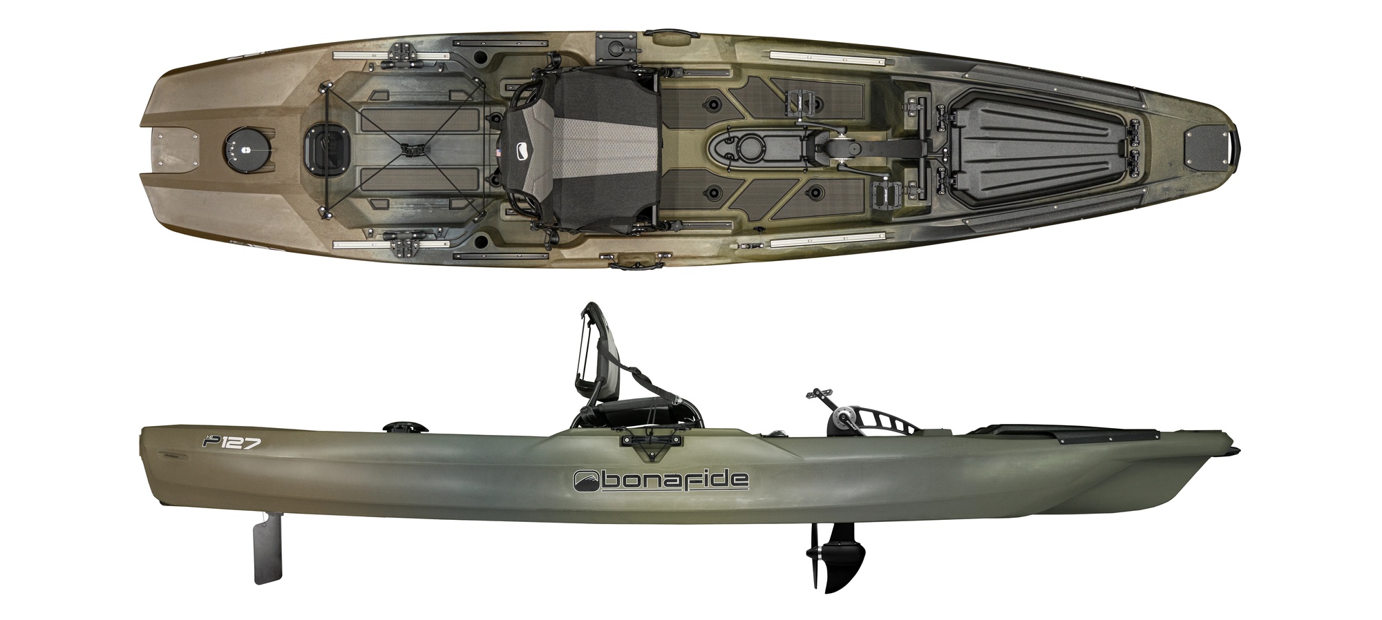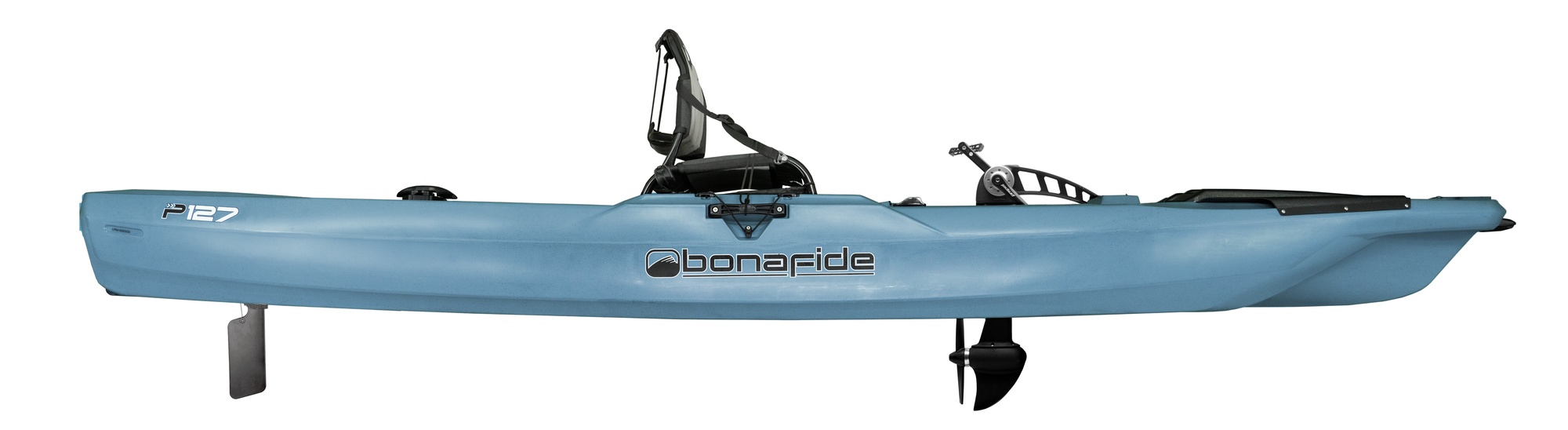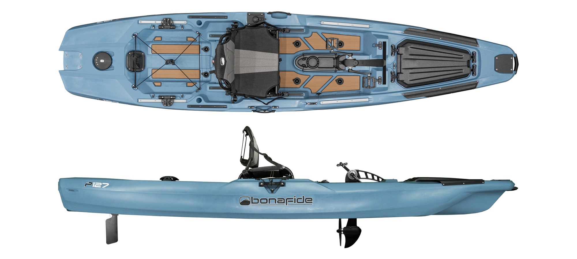 Bonafide P127 – trijų pavaros žvejybos kajakas su integruota Propel Pedal Drive sistema: plaukite pedaluojant, elektriniu varikliu arba irklu. Sukurtas ant geriausiai parduodamo SS127 pagrindo su nauja Under-Seat Storage System ir papildomais laivagalio kilimėliais (2023).