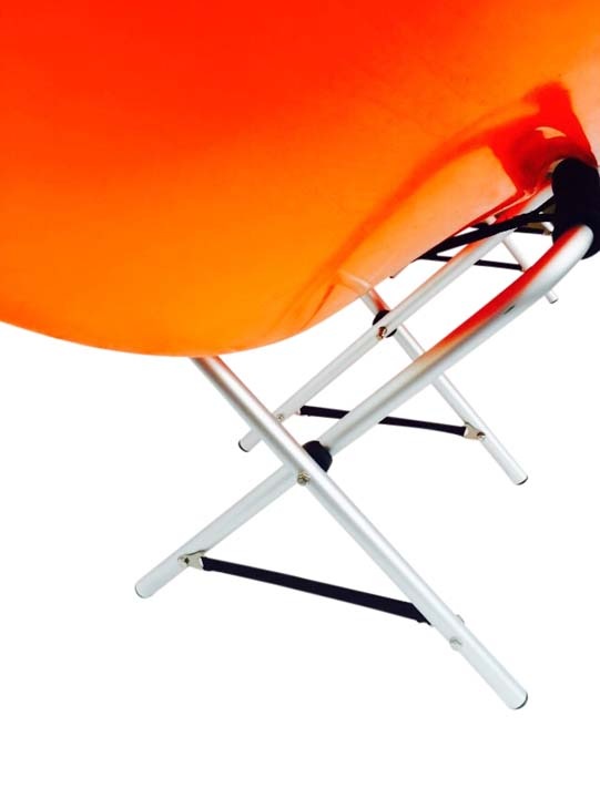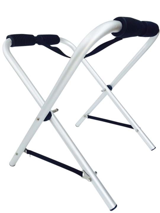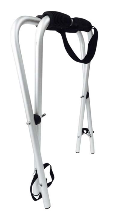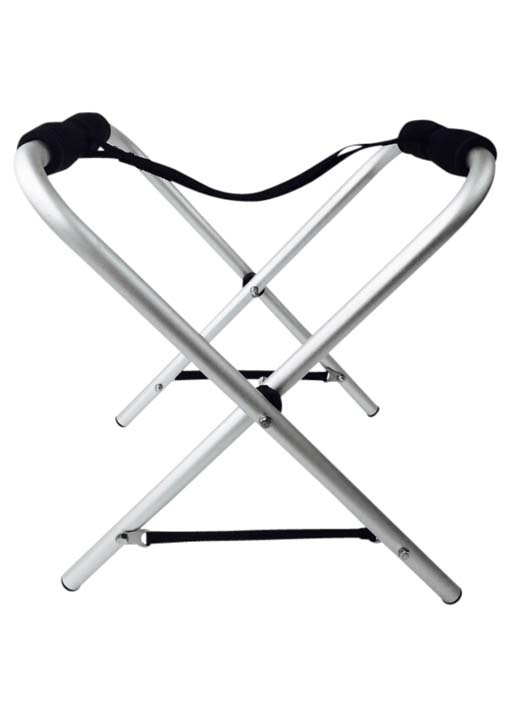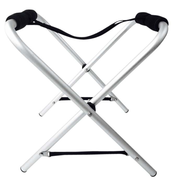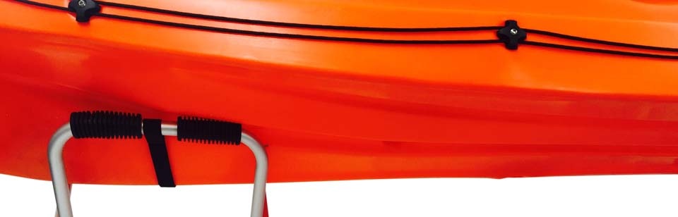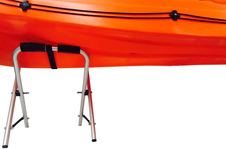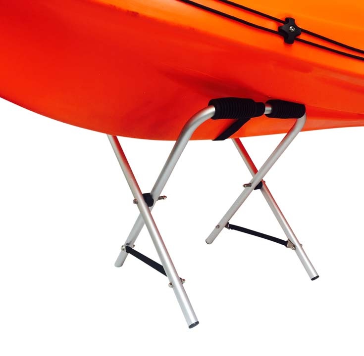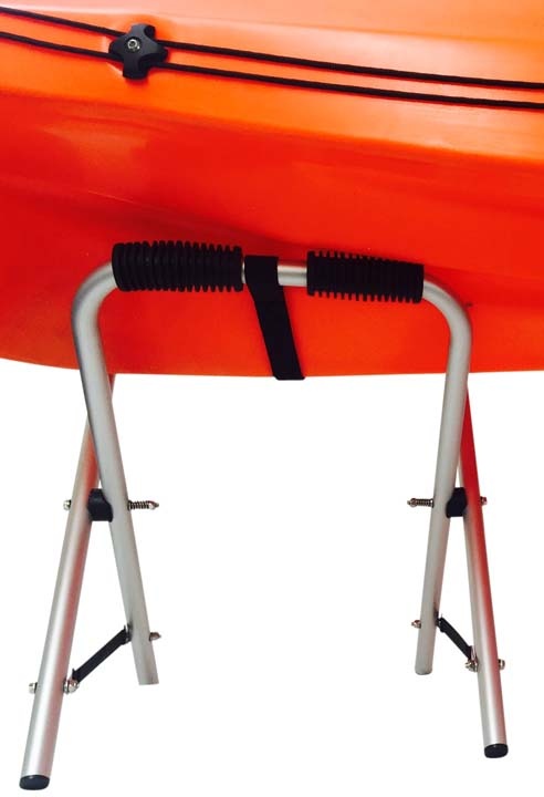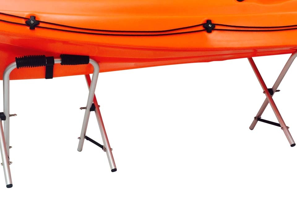 Stovą tiesiog išlankstote, pastatote ant lygaus paviršiaus ir uždėdate kajaką ant guminių rankų. Nailoniniai dirželiai tarp rankų riboja atsidarymo kampą ir neleidžia stovui persiskirti. Guminės pagalvėlės ant kiekvienos rankos apsaugo kajako korpusą nuo kontakto su metalu. Sulankstyta stovas tampa plokščias ir lengvai telpa garaže, sandėlyje ar automobilio bagažinėje.