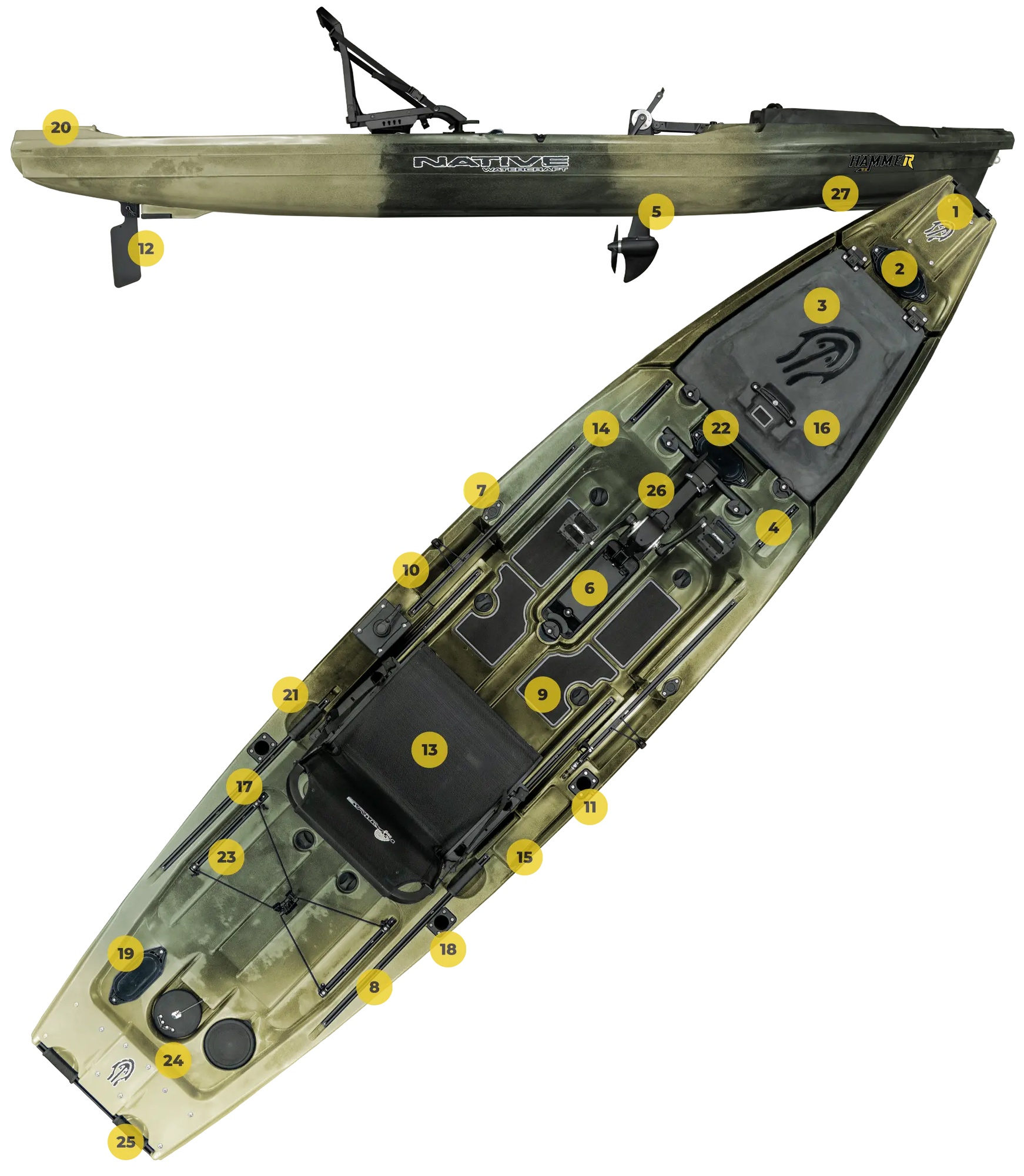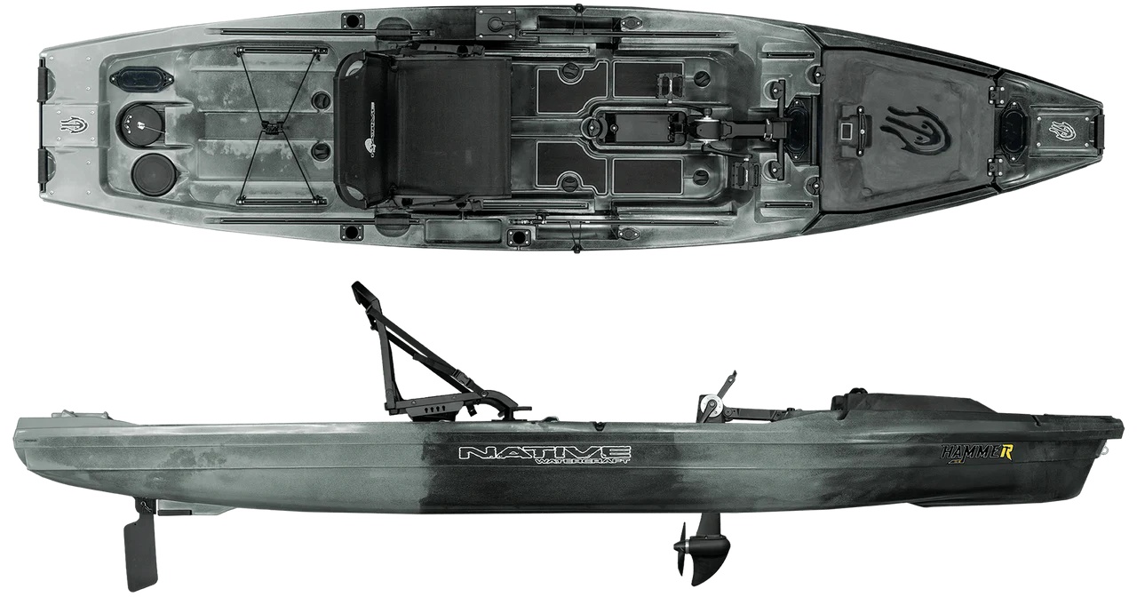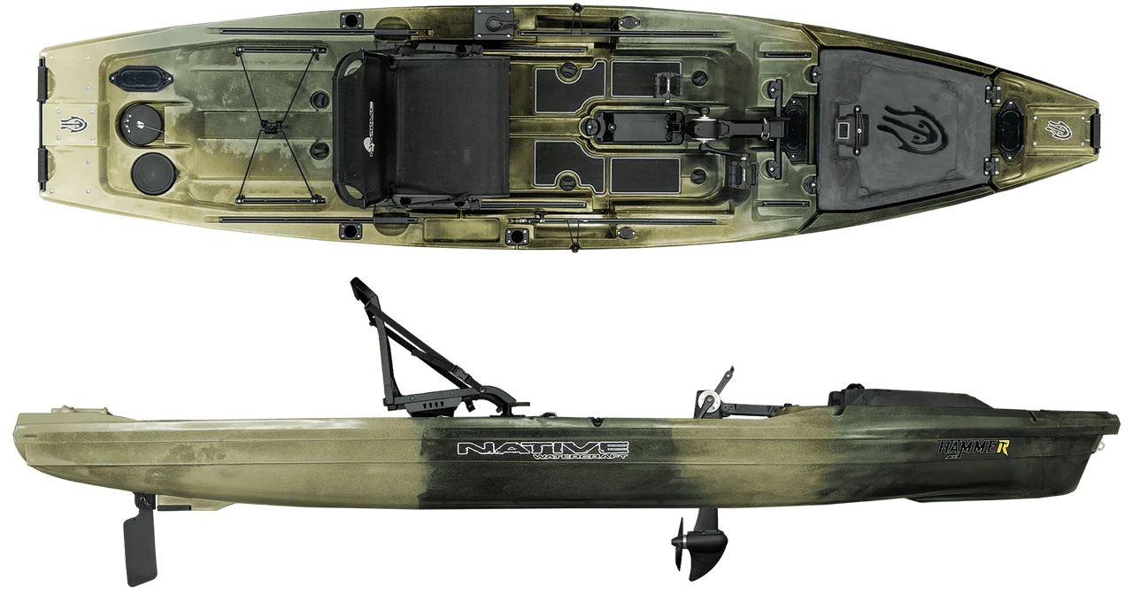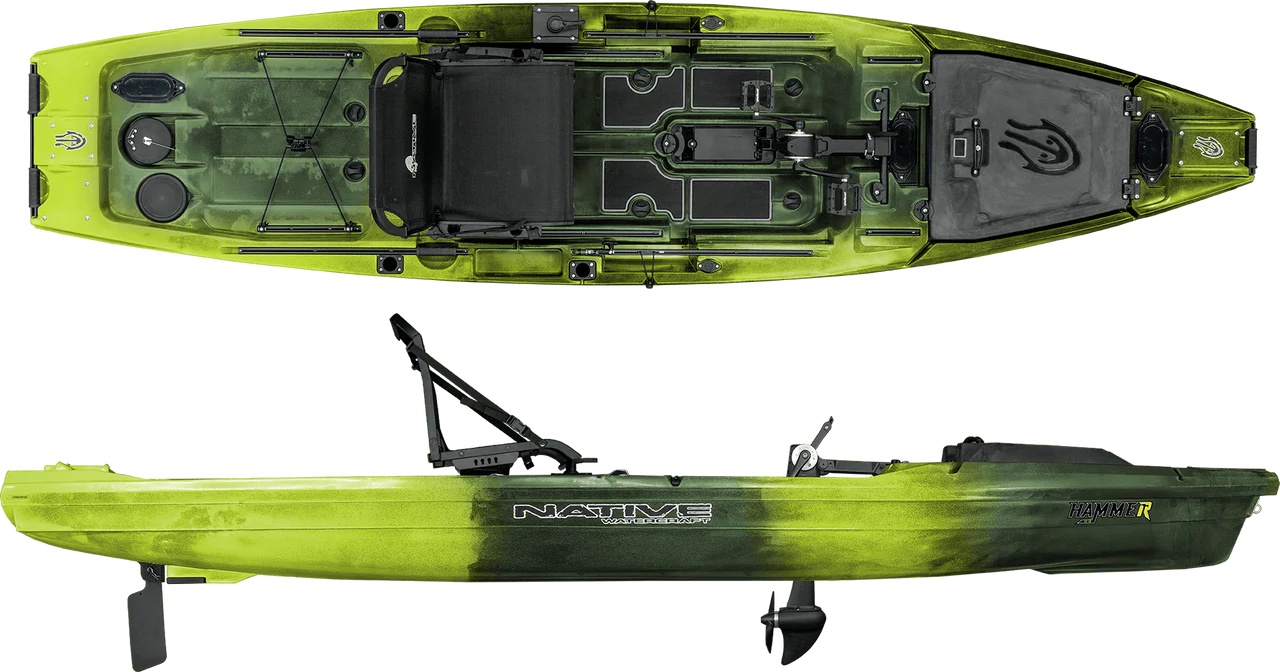 Native Watercraft Hammer 1210 – naujos kartos taktinis žvejybinis kajakas su dviguba pedaline ir motorine varomąja sistema, sukurtas žvejams, kuriems reikia švaraus tranzito, atviro denio ir išskirtinio universalumo.